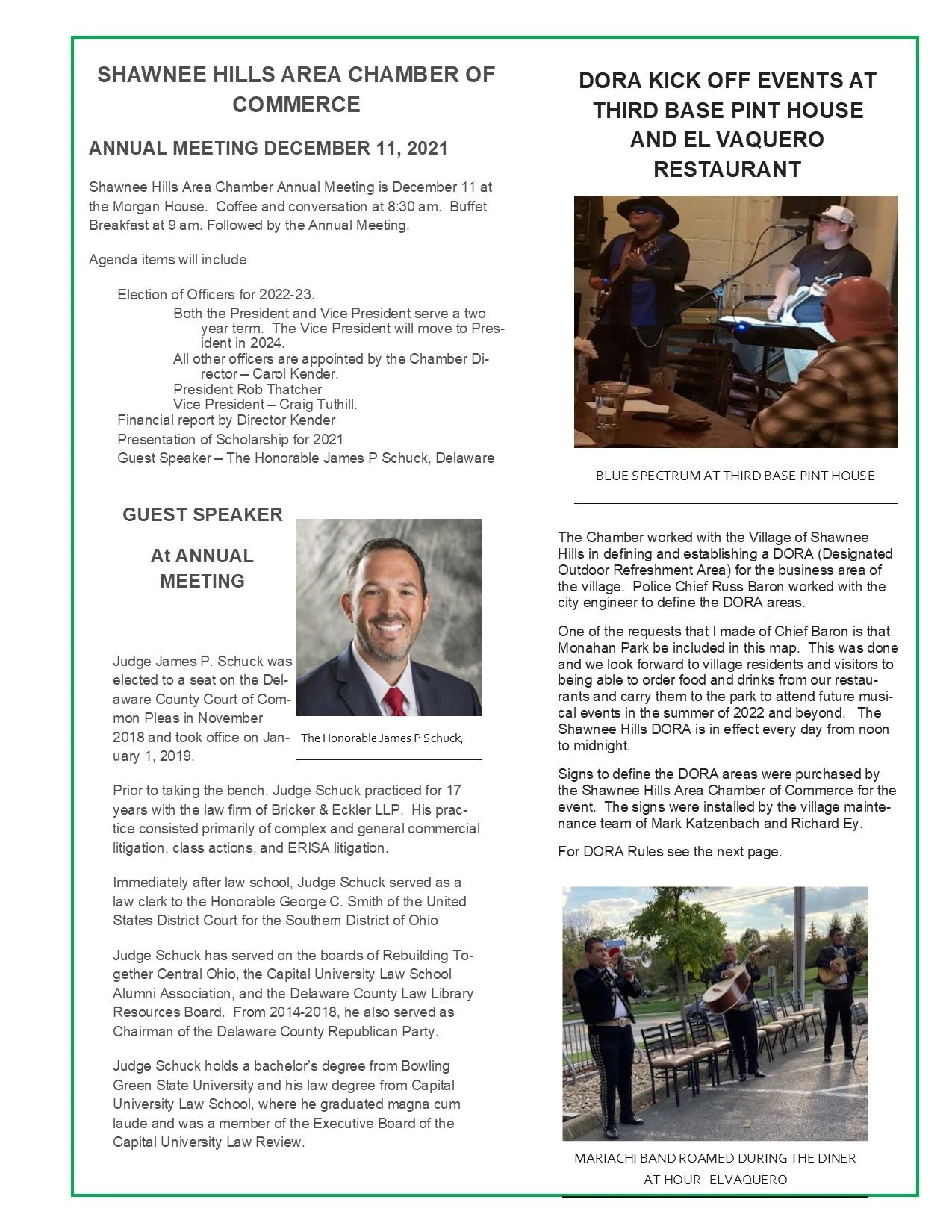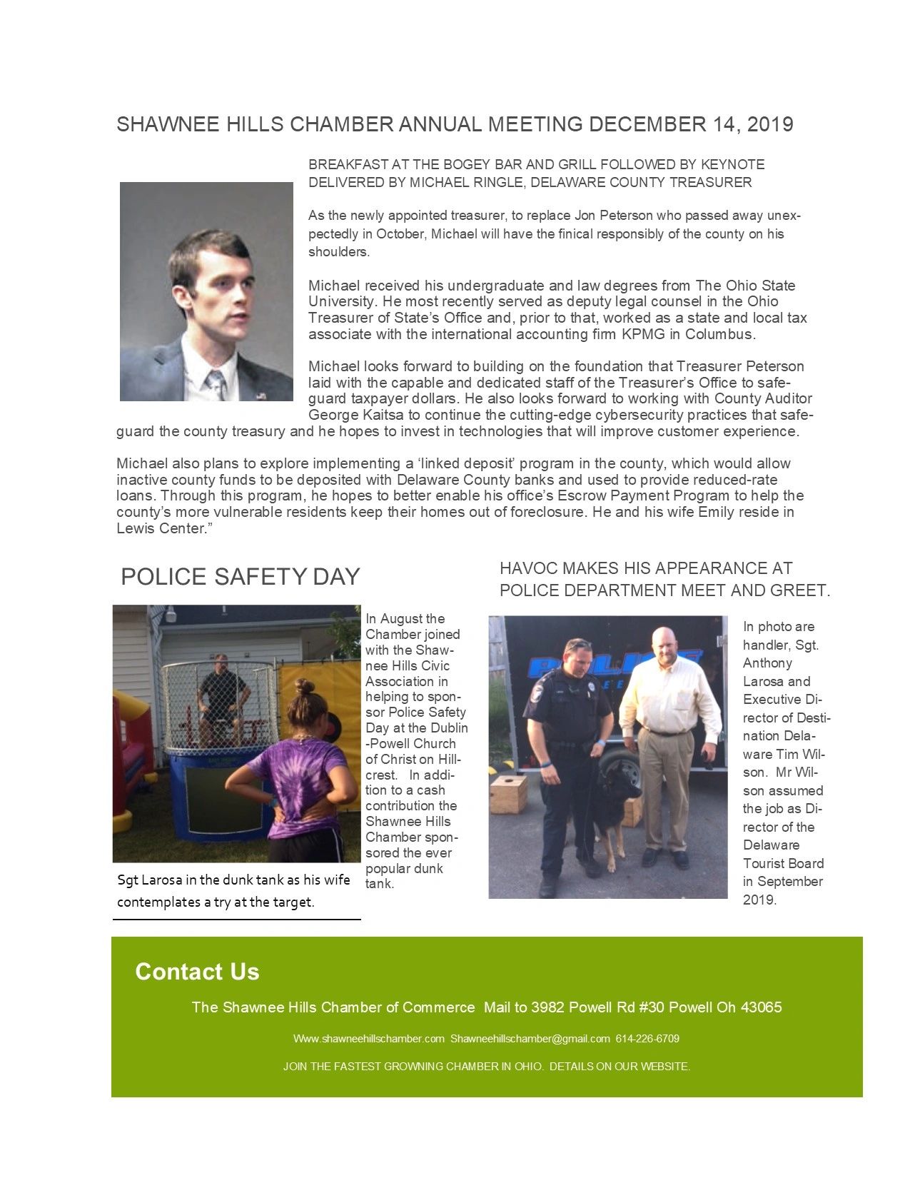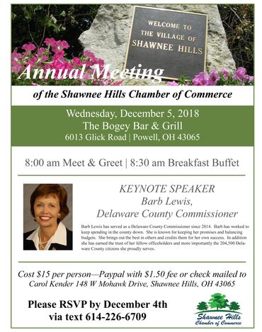 Delaware County Treasurer Michael Ringle will be the keynote speaker at the Shawnee Hills Chamber of Commerce’s Annual Breakfast Meeting December 14 at the Bogey Bar and Grill, 6013 Glick Road Shawnee Hills OH. "A buffet breakfast will be served at 10 am followed by a short business meeting and then the keynote address,” according to Carol Kender, Chamber President